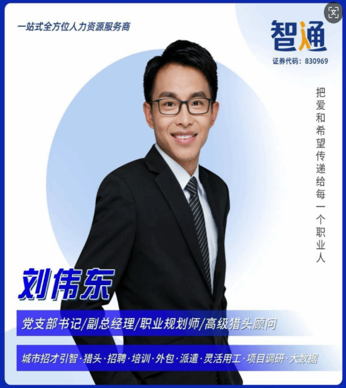 刘伟东,14届工商管理专业,优秀毕业生,公司第四届 ERP协会会长,毕业后一直在智通人才连锁集团江门分公司工作,现任公司股东,江门公司党支部书记,副总经理,职业指导师、心理咨询师和高级猎头顾问。