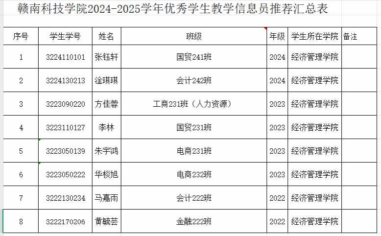 根据《赣科院教字(2024)4号关于印发《tyc1286太阳成集团教学信息员制度(试行)》的通知》要求,经员工个人申请、公司审核等程序,拟推荐国贸241班张钰轩等8位同学为优秀员工教学信息员初评人选,现将初评人选的相关情况公示如下(按年级学号排序):