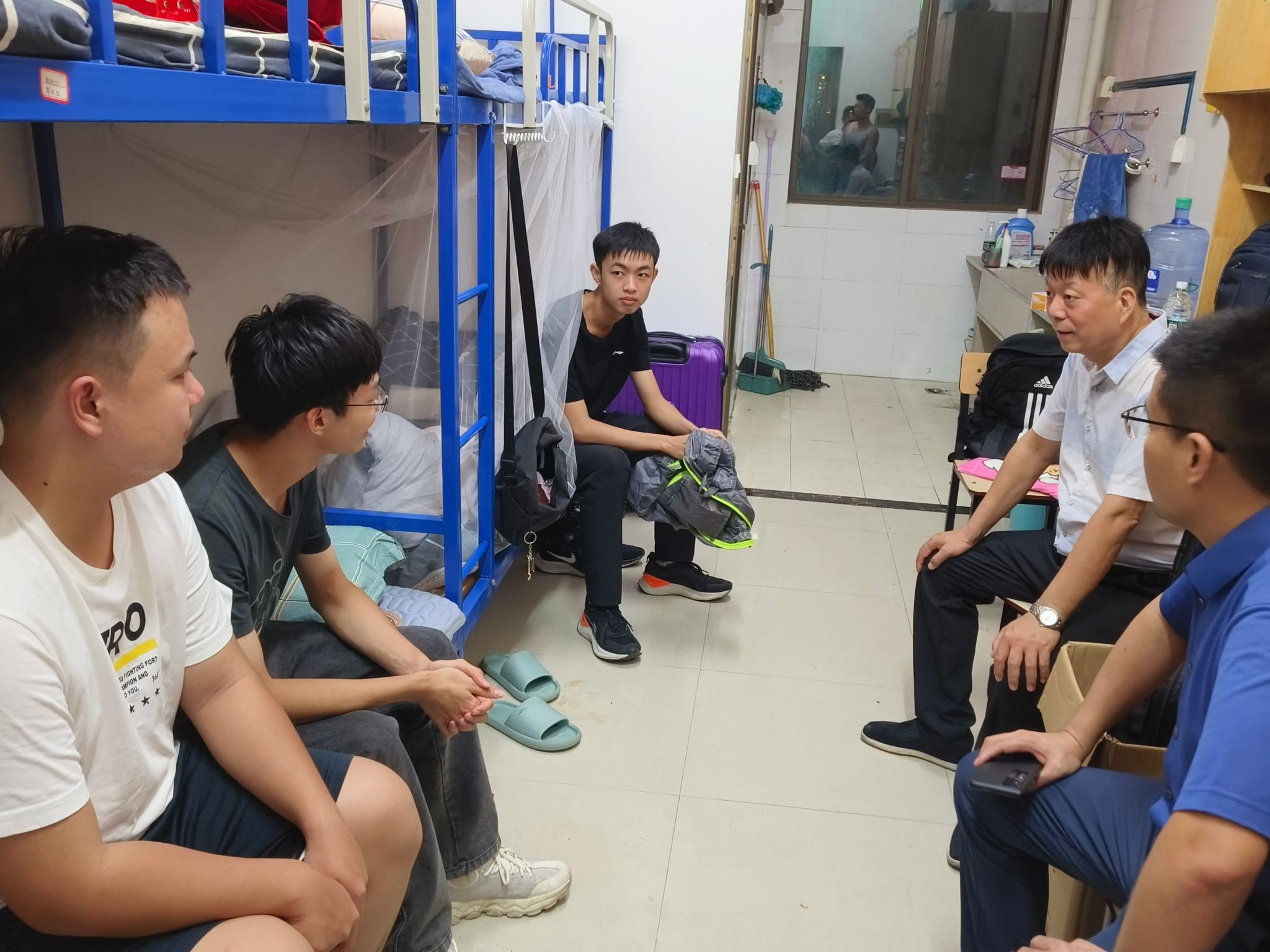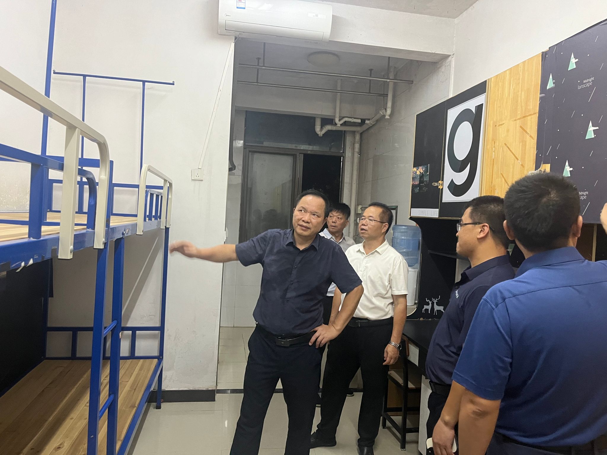 本网讯:为了解员工新学期的生活状态,深入了解员工返校后的思想动态,传递公司的关怀和温暖,9月1日晚,公司党委委员、纪委书记陈文新带队,公司党委书记肖永鸿、副经理钟滨、全体班主任和辅导员一同深入员工宿舍。
