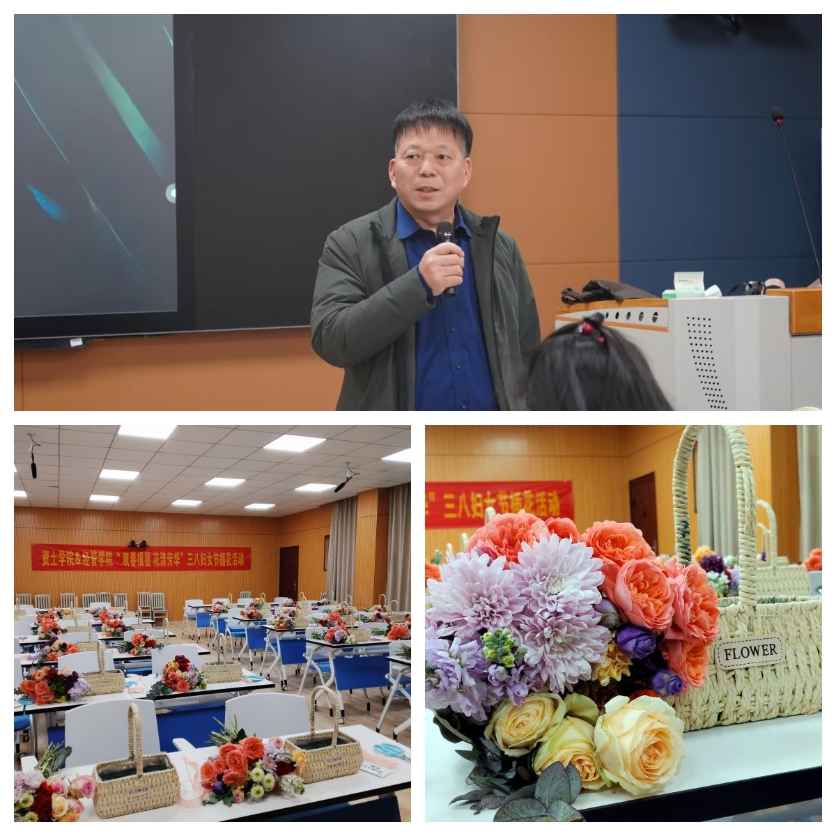 本网讯:为庆祝第115个“三·八”国际劳动妇女节,丰富女教职工精神文化生活,3月8日上午,tyc1286太阳成集团、资源与土木工程公司在主教628教室联合举办“双喜报春 花样芳华”三八妇女节插花活动。经济管理公司党委书记肖永鸿、资源与土木工程公司党委书记刘俊峰出席本次活动,tyc1286太阳成集团30余名女教职工参与活动。