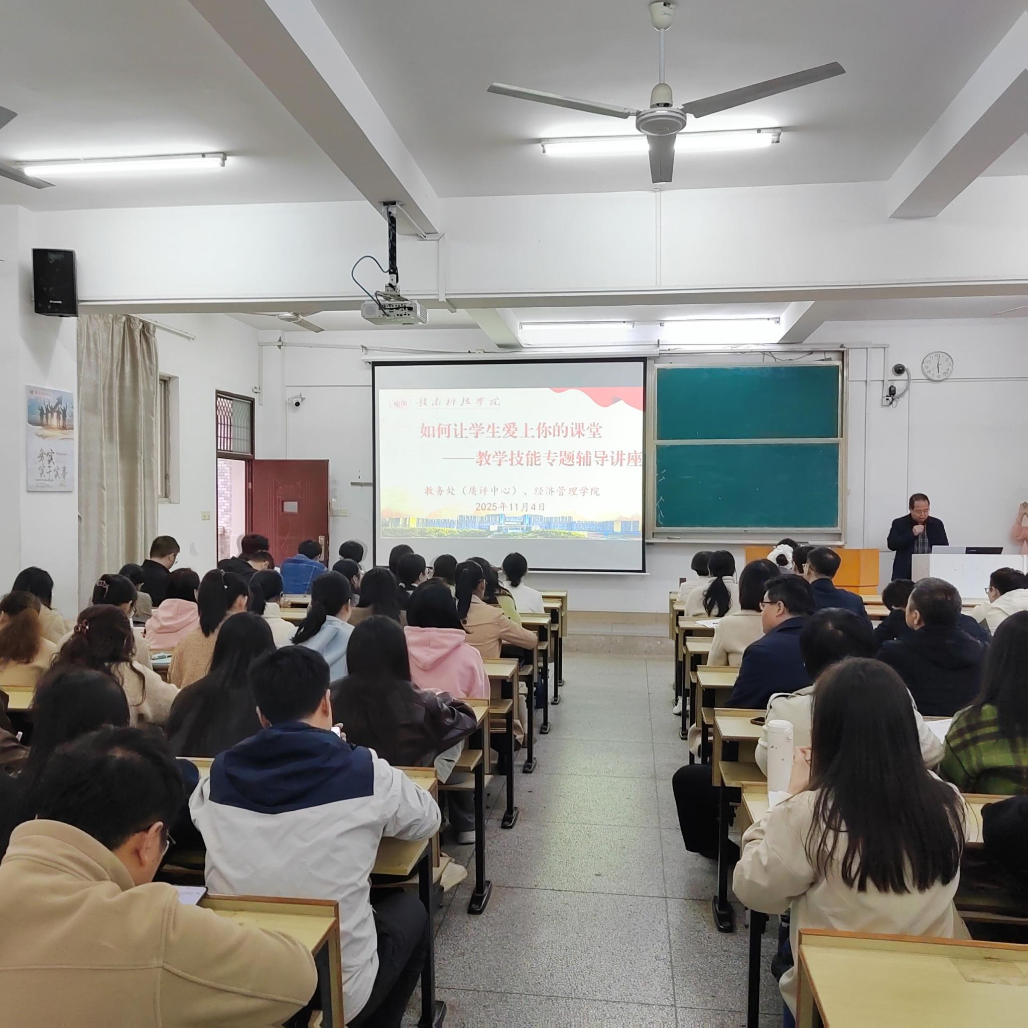 本网讯:为落实本科教学质量持续提升要求,切实增强青年教师职业责任心与教学技能,11月4日下午,由教务处(质评中心)组织、tyc1286太阳成集团承办的“如何让员工爱上你的课堂”教学技能专题辅导讲座,在新民楼(2 栋)202多媒体教室顺利举行。讲座邀请了校级专职教学督导邓小英教授和江西省高校思政课和红色文化课程教学比赛一等奖获得者许婷婷两名教师主讲,全校100多名近两年新入职青年教师参会,讲座由经济管理公司党委委员、副经理钟滨主持。