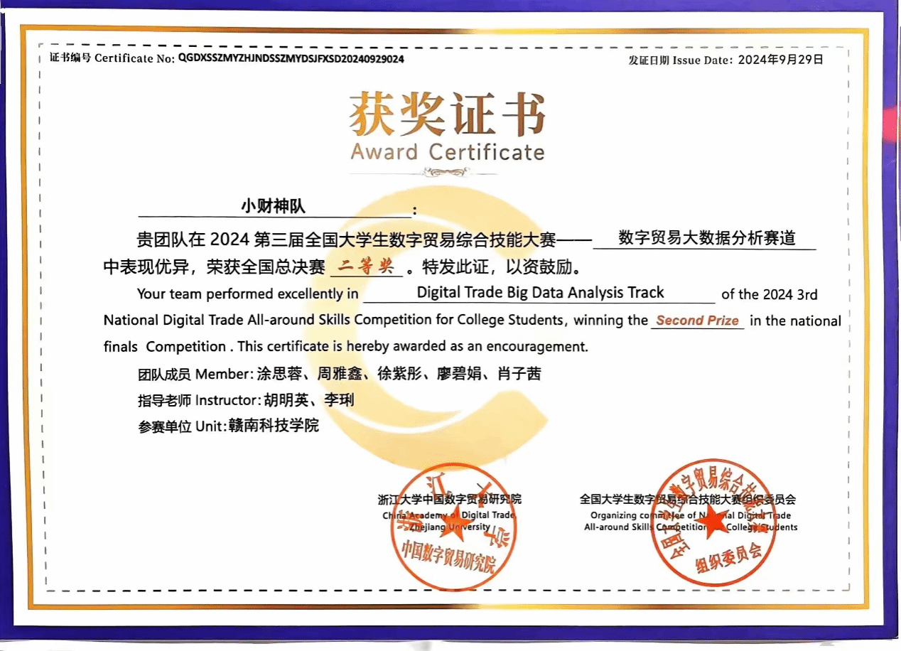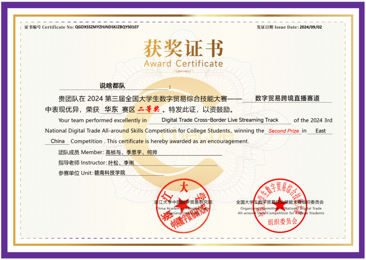 本网讯:近日,第三届全国老员工数字贸易综合技能大赛全国总决赛在浙江杭州落下帷幕。公司李琍、胡明英、叶松和邱景老师指导的5支参赛团队首次参赛,分别在大数据分析赛道、跨境直播赛道和创新创业赛道荣获全国总决赛二等奖1项、区域赛一等奖1项、二等奖2项、三等奖2项的好成绩。