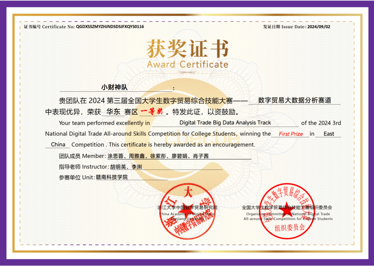 公司参赛团队自4月报名以来,在指导老师的带领下积极备赛、开展研讨,顺利从竞争最激烈的华东赛区(上海、江苏、浙江、安徽、福建、江西、山东、台湾)初赛突围,全部晋级由南京大学承办的区域赛,“小财神队”更是在大数据分析赛道脱颖而出晋级全国总决赛。此次竞赛不仅让员工对数字贸易前沿技术有了进一步的了解,更是对各院校数字贸易领域人才培养成果的一次巡礼。