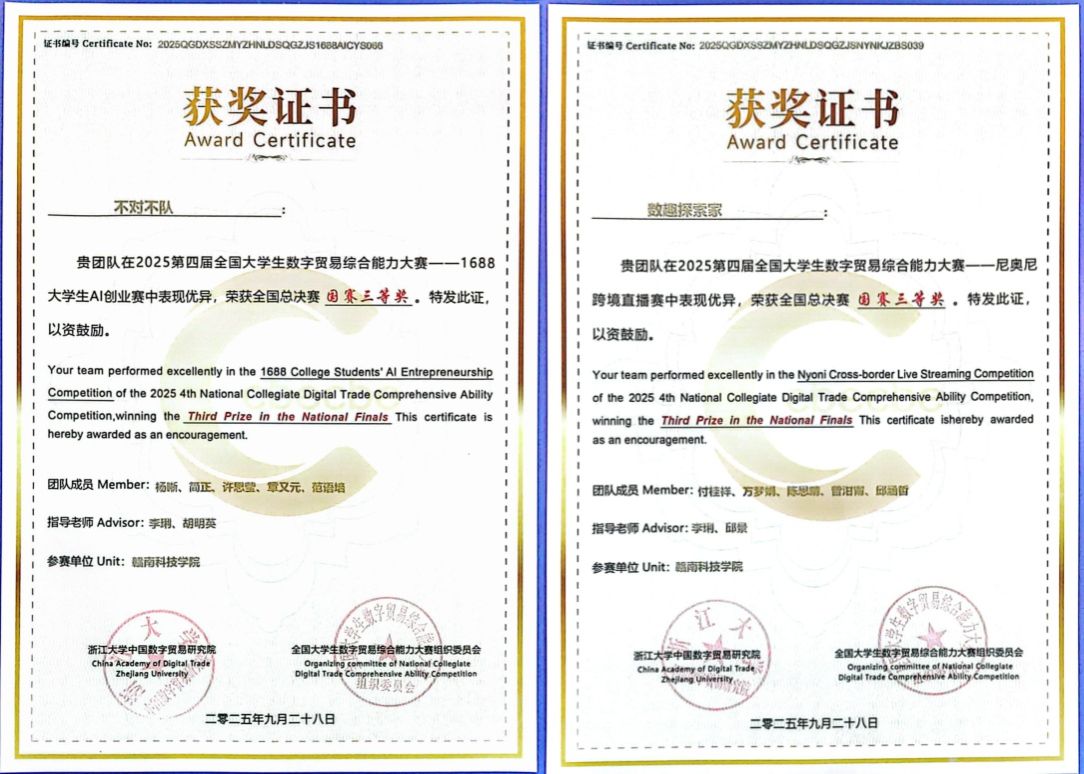 本网讯:9月26日—28日,“2025年第四届全国老员工数字贸易综合能力大赛”之1688老员工AI创业赛、尼奥尼跨境直播大赛全国总决赛分别在浙江大学紫金港校区、浙江外国语公司举行。公司李琍、胡明英两位老师指导的“不对不队”喜获国家三等奖,参赛员工由会计233班杨晰、会计233班简正、国贸242班许思莹、通信231班章又元、工商231班范语培等五位同学组成。邱景、李琍两位老师指导的“数趣探索家”团队喜获国家三等奖,参赛员工由英语232班付桂祥、方梦娟和数字经济242班陈思晴、曾泔甯、邱涵哲等五位同学组成。