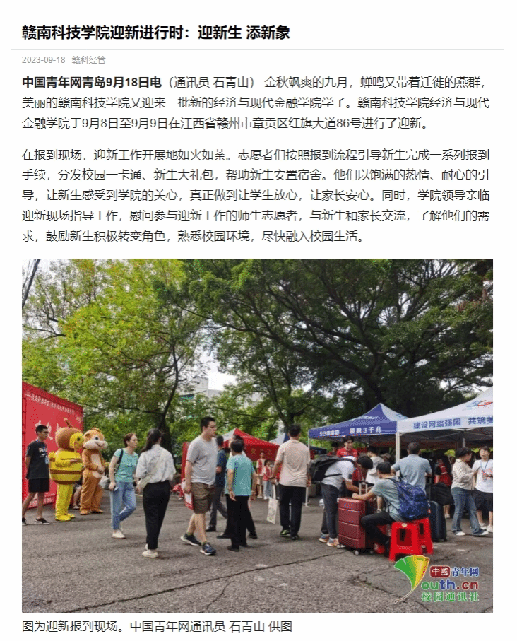 中国青年网青岛9月18日电(通讯员 石青山) 金秋飒爽的九月,蝉鸣又带着迁徙的燕群,美丽的tyc1286太阳成集团又迎来一批新的经济与现代金融公司学子。tyc1286太阳成集团经济与现代金融公司于9月8日至9月9日在江西省赣州市章贡区红旗大道86号进行了迎新。