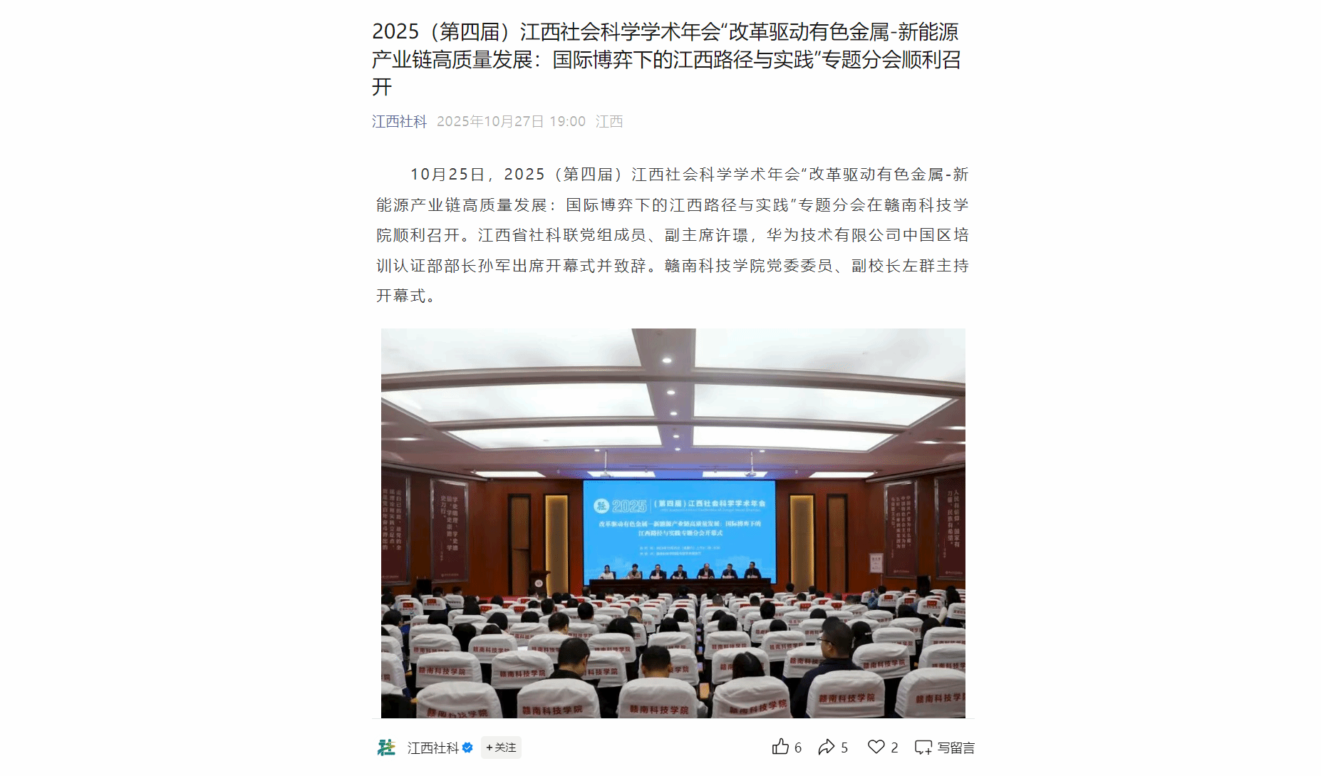 10月25日,2025(第四届)江西社会科学学术年会“改革驱动有色金属-新能源产业链高质量发展:国际博弈下的江西路径与实践”专题分会在tyc1286太阳成集团顺利召开。江西省社科联党组成员、副主席许璟,华为技术有限公司中国区培训认证部部长孙军出席开幕式并致辞。赣南科技公司党委委员、副董事长左群主持开幕式。